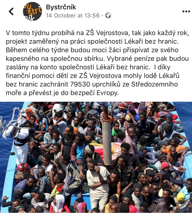 This week, much like every year, a project focusing on the work of Médecins sans frontières is taking place at the Primary School Vejrostova. Throughout the week, the pupils will have the chance to contribute from their pocket money towards a collective fund. The collected money will then be sent to the account of Médecins sans frontières. Thanks to the contributions made by, among others, the Primary School Vejrostova, the ships of the Médecins sans frontières have been able to save 79,530 refugees from the Mediterranean and bring them to safety in Europe.