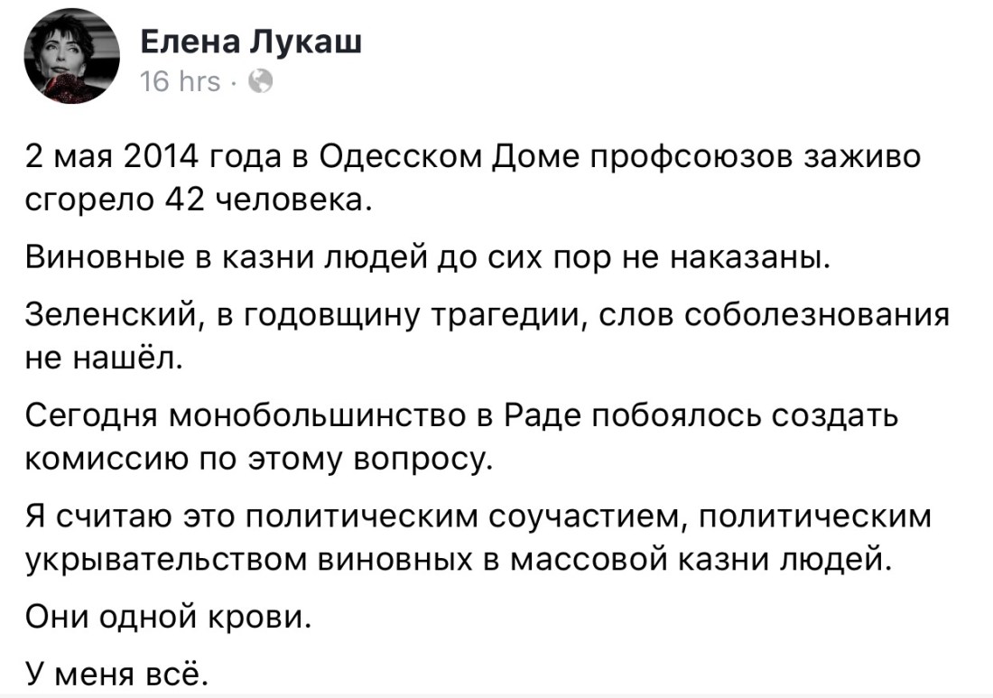The former Minister of Justice of Ukraine, Elena Lukash thinks the refusal of the parliamentarians from the “Servant of the People” party to set up a committee to investigate the Odessa tragedy amounts to a political cover up of a mass execution.