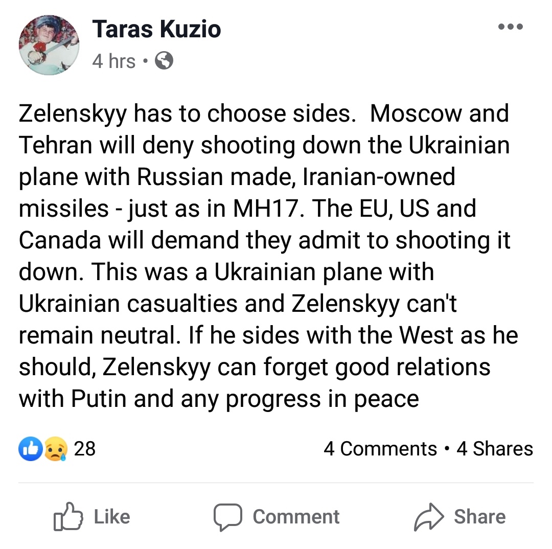 One thought on “Taras Kuzio Blames Russia for Shooting Down the Ukrainian Plane Over Iran”