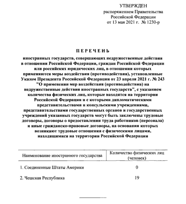 The list of countries committing unfriendly acts is below, with the number of Russian citizens they can employ at their missions indicated to the right. The Americans are allowed 0 Russian employees, the Czechs only 19.