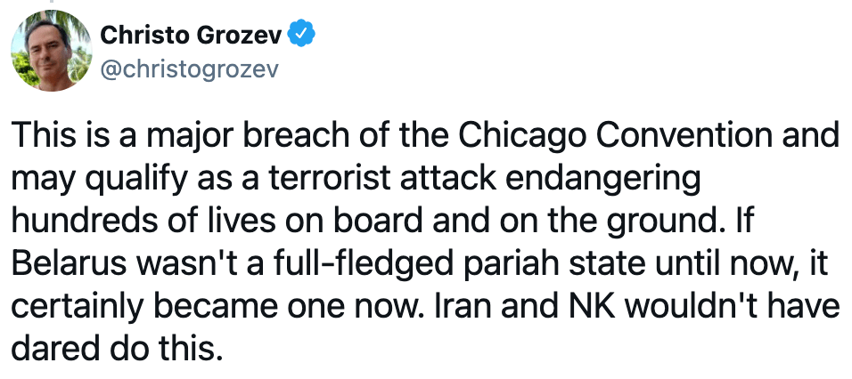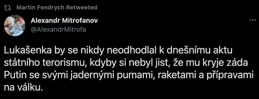 Alexandr Mitrofanov – a Czech journalist of Russian origin. My elderly mother calls him “a traitor.”: Lukashenko would never stoop to todays act of state terrorism if he wasn’t certain that Putin has his back with his nuclear bombs, rockets and preparations for war.