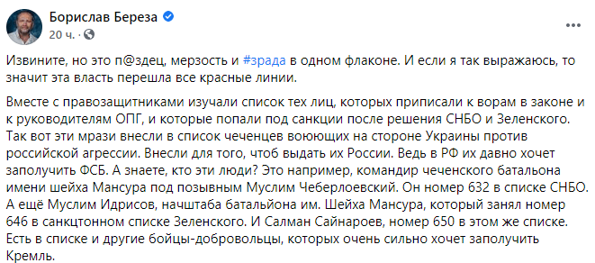Together with human rights defenders we have dissected the list of names, allegedly being the heads of criminal organisations, and that have received sanctions from the security council and Zelensky. Well, these bastards have brought into the list Chechens that have fought on the side of Ukraine against Russian aggression. They have put them on the list to extradite them to Russia. They are already wanted by the FSB. Do you know who they are, the commander Muslim Ceberloevsky, #632 in the security council list, and the chief of staff of the Sheikh Mansur Battalion, Muslim Idrisov, whi is #646 in Zelensky’s list of people to be sanctioned. Salman Saynaroev is #650. There are other volunteer fighter, whom are wanted by the Kremlin.