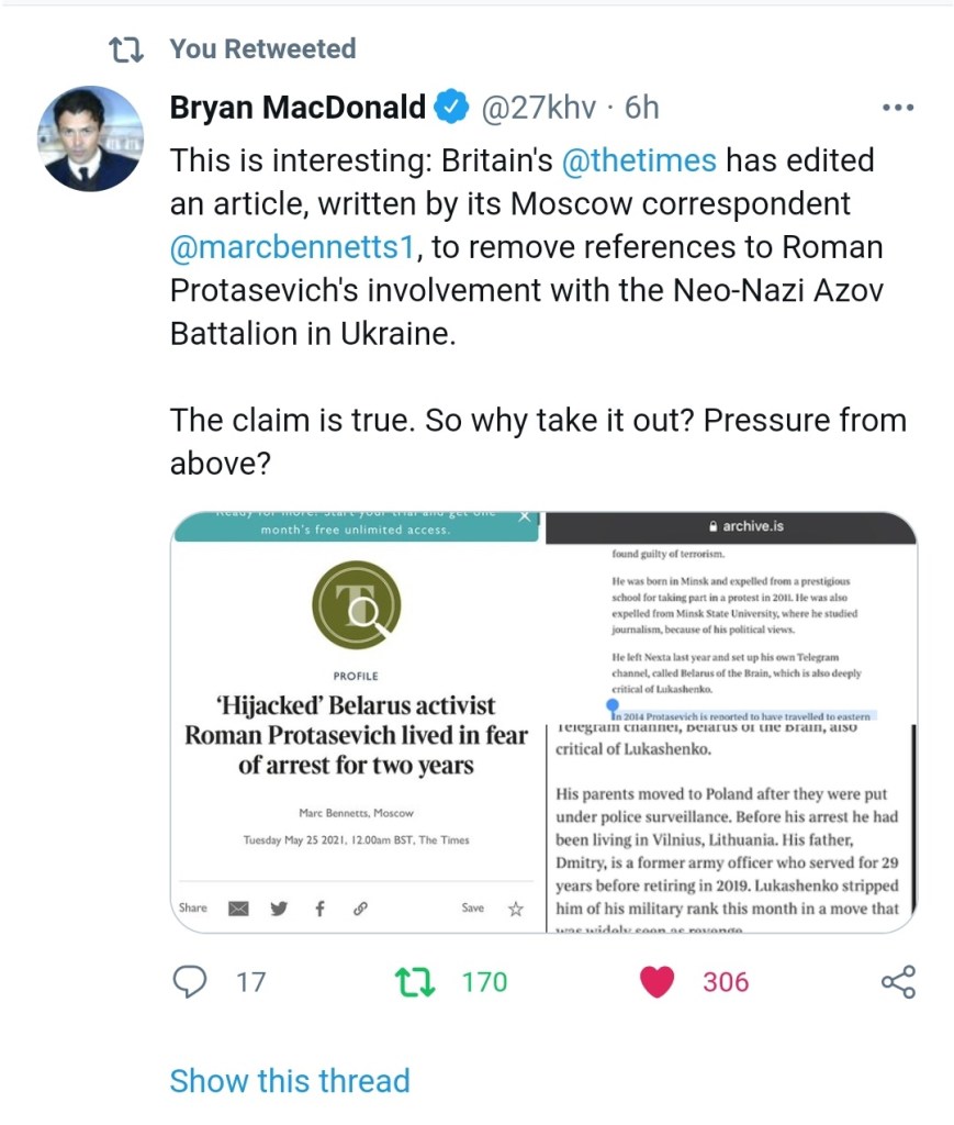 Number of Blue Checkmarks, and other guardians of the narrative, have immediately tried to call the reports about Protasevych’s Azov engagement a disinformation. But his involvement with the Neonazis is now solidly established.