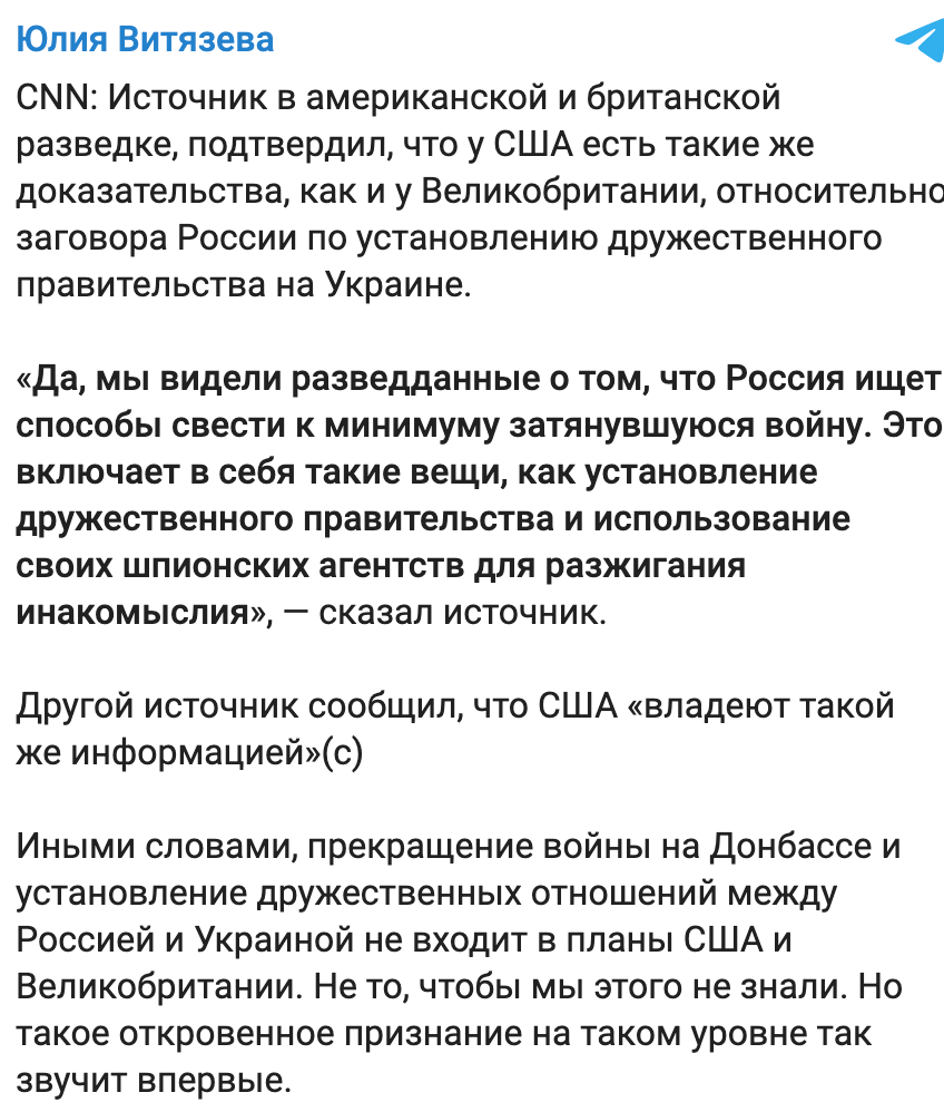 CNN: Sources in the US and British secret services has confirmed that the United States possess the same evidence concerning the Russian plot to install a Russia friendly government in Ukraine. Yes we have seen intelligence that Russia seeks ways to prevent a prolonged war. This includes the instalment of a Russia friendly government and the usage of spy agencies to spread opposing ideas. -said the source. That is in other words, ending the war in Donbas and establishing good relations between Russia and Ukraine is not in the plans of US and Britain. It is not like we did not know that. But such an open admission, that’s a first.