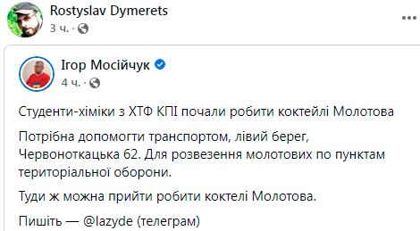 Molotov Cocktail War? insomniacresurrected Ukraine 25th Feb 202225th Feb 2022 1 Minute Igor Mosiychuk: Students chemists began to make molotov cocktails. We need help with transport (lol), left bank. Chervonotskaya 62. To distinbute molotovs among the home defence. You can join us and make molotovs with us. Earlier Share this: Click to share on X (Opens in new window) X Click to share on Facebook (Opens in new window) Facebook Like Loading... Published by insomniacresurrected View all posts by insomniacresurrected Published 25th Feb 202225th Feb 2022