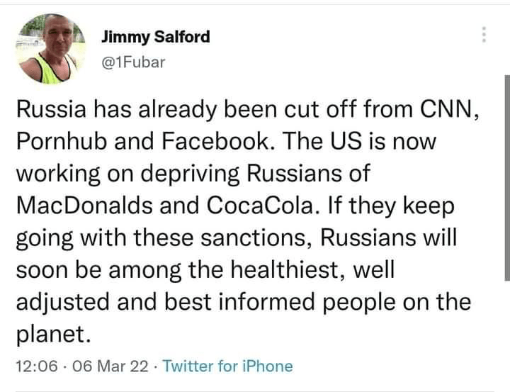America Cancels Cancer in Russia insomniacresurrected Containing Russia, Cursed Images, Murica, Ukraine 9th Mar 2022 1 Minute Share this: Share on X (Opens in new window) X Share on Facebook (Opens in new window) Facebook Like Loading... Published by insomniacresurrected View all posts by insomniacresurrected Published 9th Mar 2022