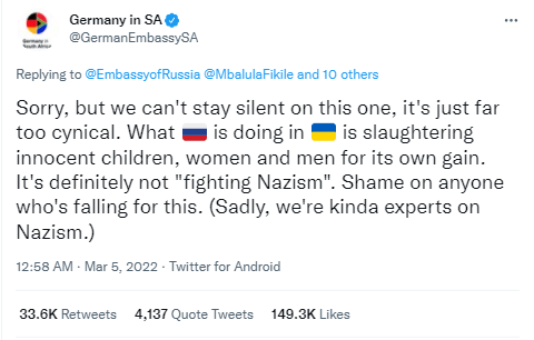 So, Russia is not fighting Naziism, Russia does it only for its own gain, muh women, muh children (trying to get everyone on the same moral panic that grips the globohomo now). Remember that slave, and so that you don’t forget, we turned off RT and Sputnik… By the way, they are experts on Naziism, and the Ukrainians are doing it wrong.