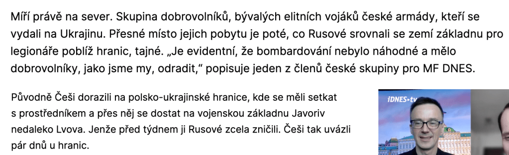 They are heading north. A group of volunteers, former elite soldiers of the Czech Army, who have gone to Ukraine. Their exact location is secret after the Russians levelled the legionnaire base near the border. “It is clear that the bombing was not accidental, it was intended to dissuade volunteers like us” -one of the members of the Czech group told MF DNES. They have initially arrived at the Polish-Ukrainian border, where they were to meet a middleman that would take them to Yavoriv near Lvov. However, about a week ago that base was completely obliterate by the Russians. The Czechs were stuck at the border for several days.