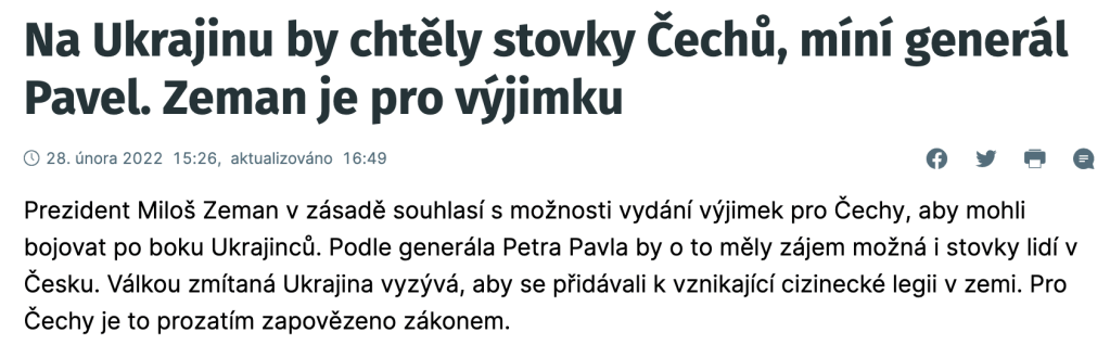 Hundreds of Czech would like to go fight in Ukraine alongside Ukrainians. General Petr Pavel says that perhaps hundreds of people in the Czech Republic would be willing to go. War gripped Ukraine is calling on volunteers to join its foreign legion. The Czechs are still not allowed by law to join.