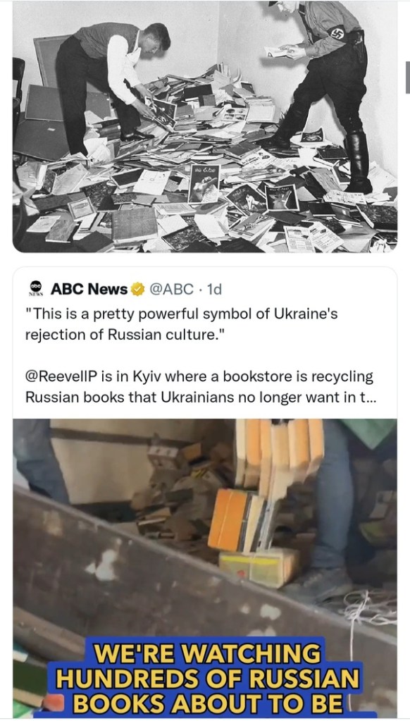 Book Burning insomniacresurrected Russophobia, Ukraine 26th Feb 2023 1 Minute Where did they get so many books in Russian, is it that Russian is the dominant language in Ukraine? Share this: Click to share on X (Opens in new window) X Click to share on Facebook (Opens in new window) Facebook Like Loading... Published by insomniacresurrected View all posts by insomniacresurrected Published 26th Feb 2023