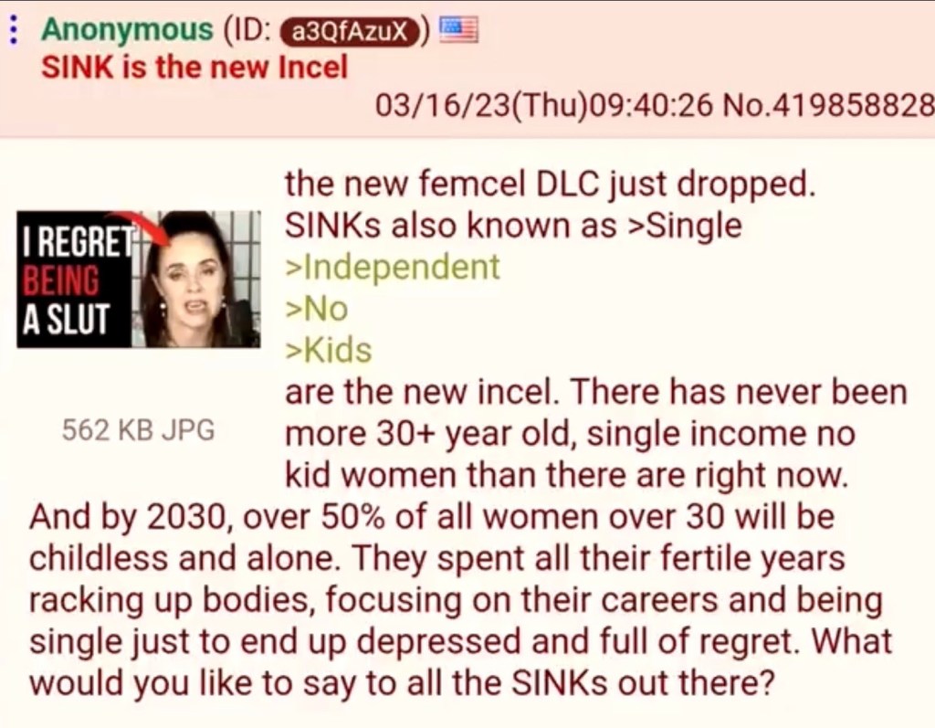 So basically, SINKs are women my age that traded the chance of having a family for a career. Now their ass is 40, and they are strong and independent and probably drunk on cheap wine, mothers to multiple cats, and psychiatry patients. What can I say?