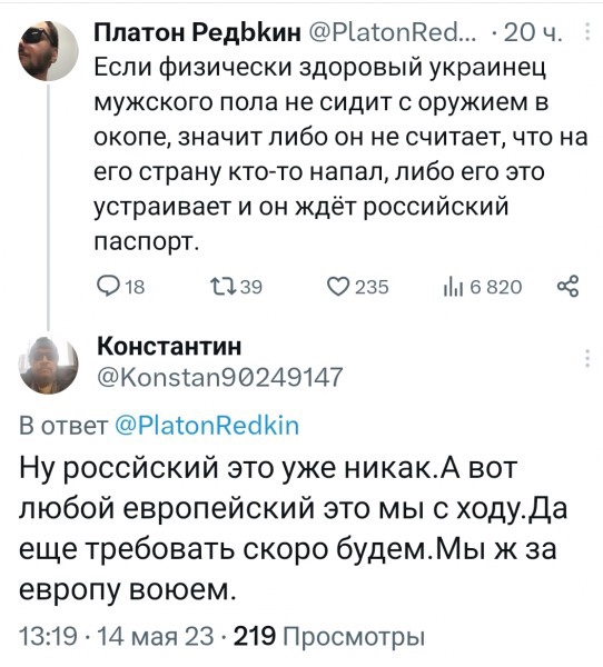 Platon Red’kin: If a physically healthy Ukrainian of the male gender is not sitting in the trenches with a rifle, he either does not think that his country was attacked, or he is cool with it and awaits a Russian passport.