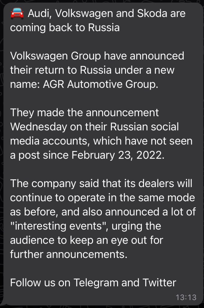 Volkswagen is Coming Back to Russia insomniacresurrected Containing Russia, Zrada 10th Aug 2023 1 Minute Sure, why deprive yourself of a market of 150 million people just to help some thieves in Ukraine? Share this: Click to share on X (Opens in new window) X Click to share on Facebook (Opens in new window) Facebook Like Loading... Published by insomniacresurrected View all posts by insomniacresurrected Published 10th Aug 2023
