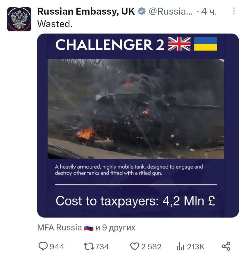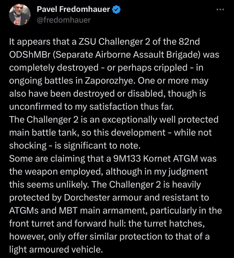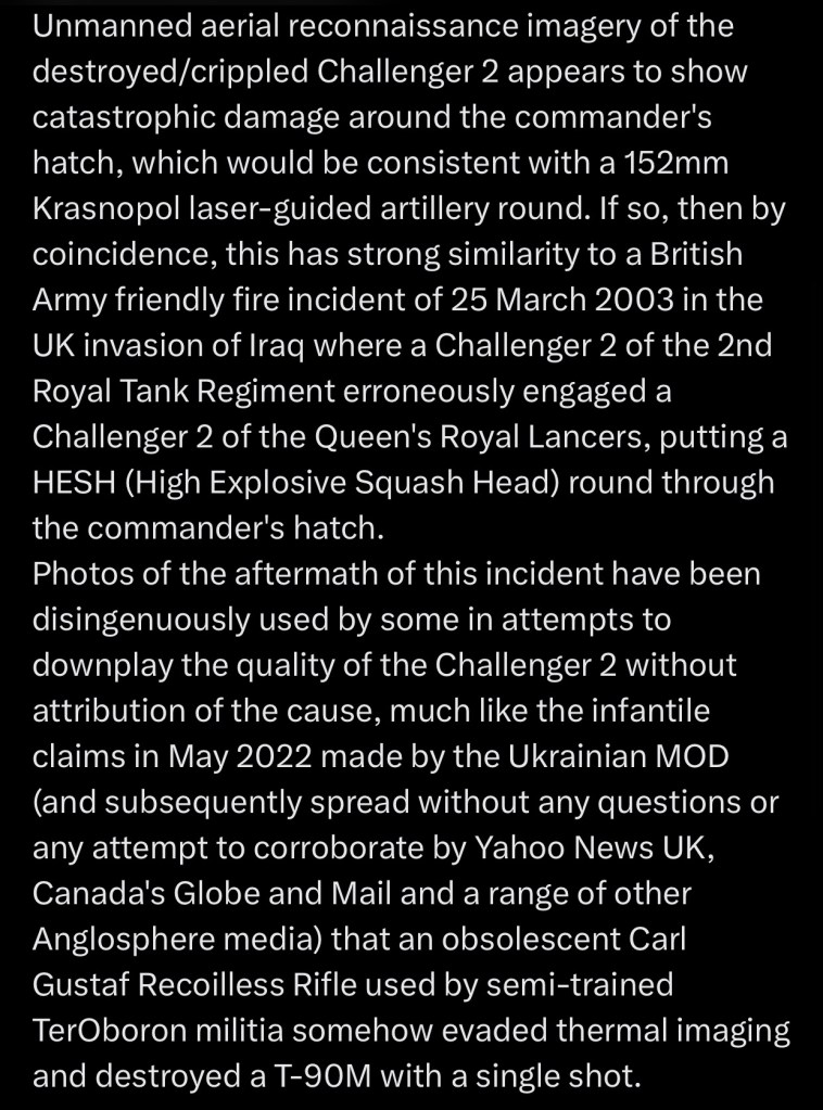1. They were bragging about the Brits supplying challenger 2 to Ukraine back then when the leopards got wrecked. They act like challenger 2 is something that can become a game changer. Now challenger 2 got wrecked too. I’m not sure what they gonna say now.