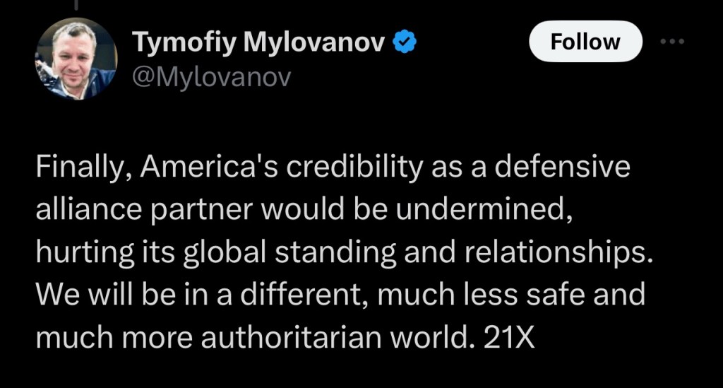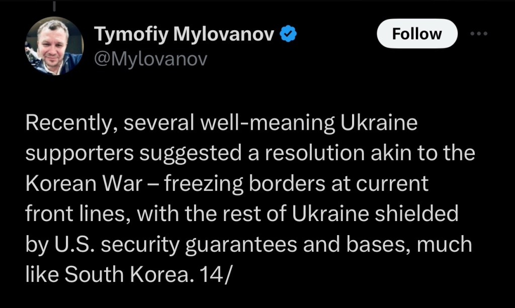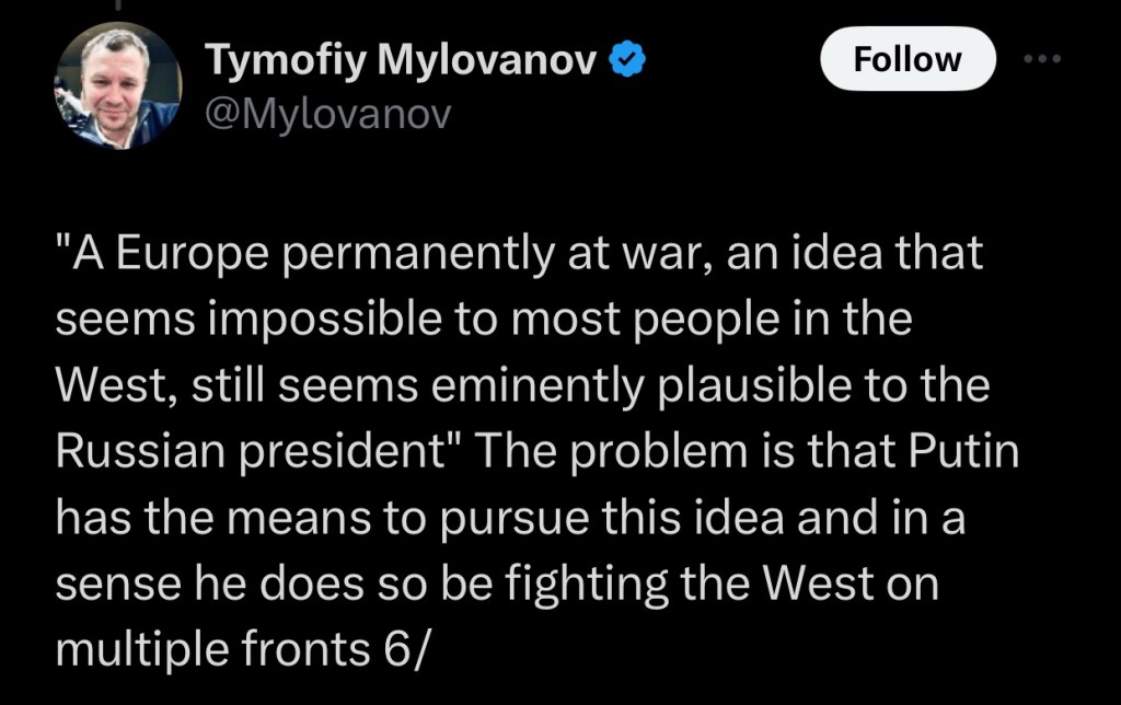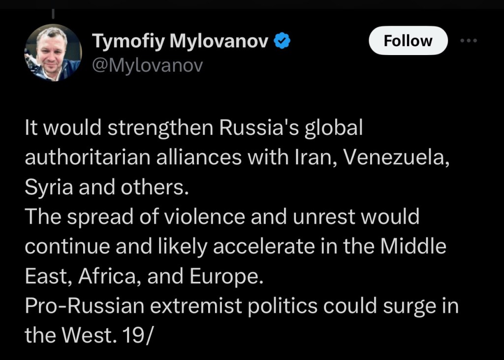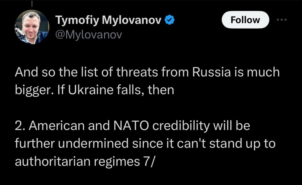 So Anne Applebaum wrote a piece for The Atlantic, which encourages further Ukrainian resistance to Russian intervention. Timofiy Mylovanov has written a thread on X that recounts the content therein.