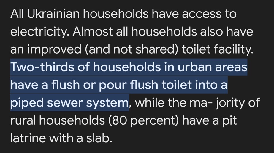 I wonder, do the NAFO trolls ever sit down and ask themselves how many people in Ukraine have proper plumbing and modern toilets? A little Google search reveals that it is nothing to write home about.