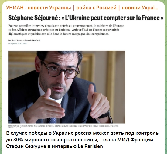 In case of Russian victory in Ukraine, Russia will control 30% of the World export of wheat 🌾 Said Stéphane Séjourné, the French Minister of Foreign Affairs.