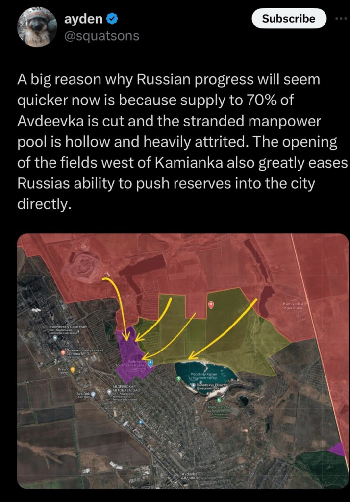 I personally expected the town to fall around March. I was probably conditioned by the siege being on since October. But then again Russia takes its time before it pounces. I wonder where they will move the front. After all, Avdeevka was a fortress built over the last decade, can they build anything like it in few weeks?