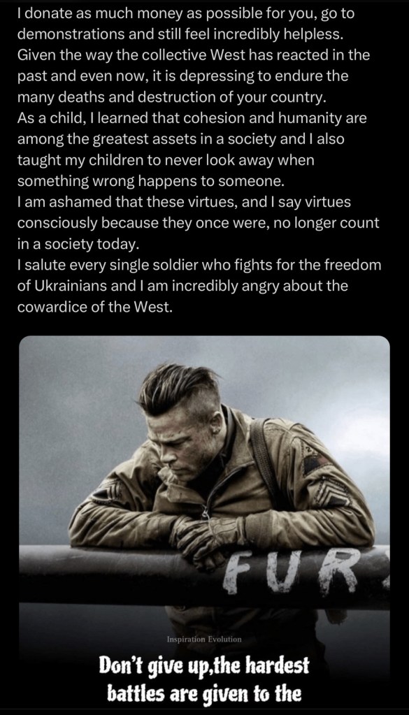 Dear pro-Ukrainians, sell all your belongings and send them to Ukraine. Ukraine needs the money more than you. It will likely be stolen and will make local businessmen very rich, they will buy properties on French Riviera for it. Don’t you find it cynical that the Ukrainians have to fight and die for your freedom? Your freedom!