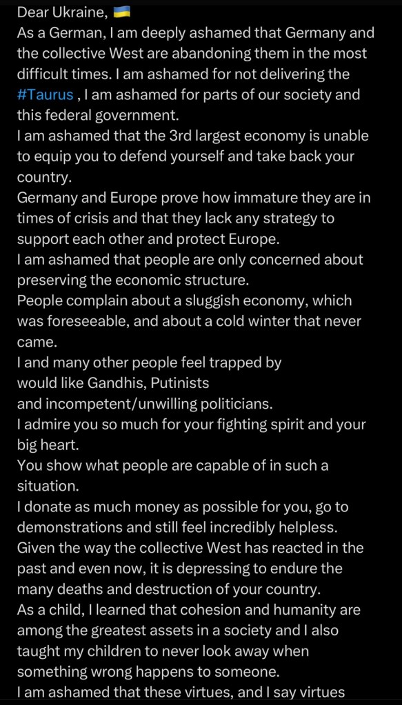 Two years ago, Russia attacked Ukraine (I thought they were there since 2014) . We were among the first to offer help. The Ukrainians are not only fighting for their freedom and democracy but also for ours. The war is dragging on and a fatigue sets in. We should not fall victim to it as our predecessors did in WWII. (Did these historical illiterates ever read the 1942 Declaration of United Nations?)