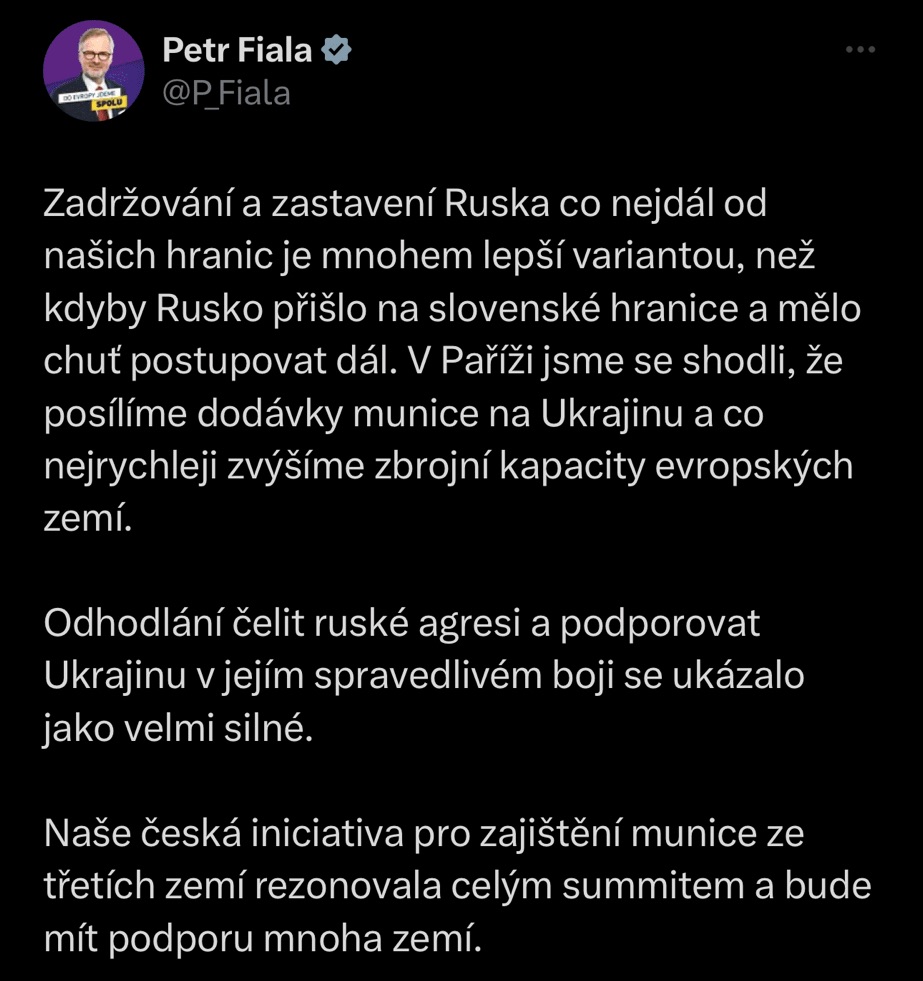 Blocking and containing Russia as fast as possible from our borders is a better option to Russia arriving at the Slovak border with the appetite to move further. In Paris, we have agreed to deliver more ammo to Ukraine, and we will increase military production capacities in Europe.