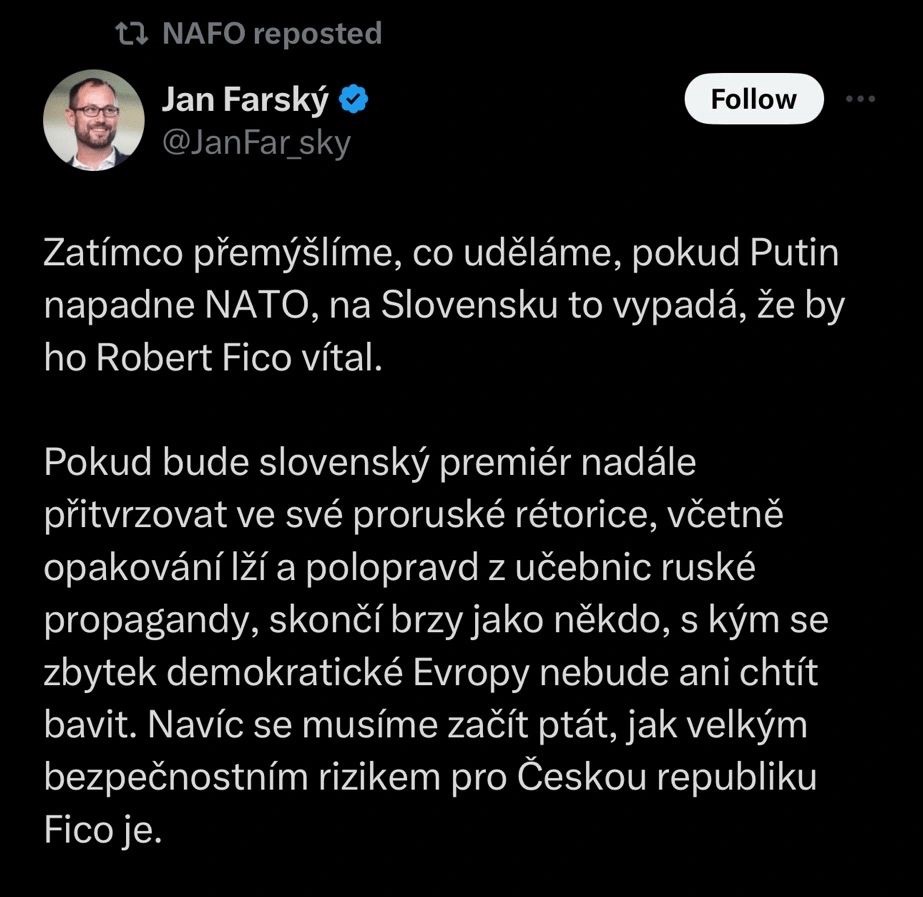 If the Slovak prime minister continues to harden his pro-Russian rhetoric, including the repeat of lies and half-truths for the Russian propaganda textbook, he will soon end up as somebody who will not be talked to in democratic Europe. We have to ask ourselves how much of a security danger Fico is for the Czech Republic?