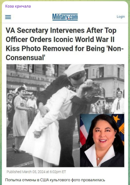 RimaAnn Nelson, the VA’s assistant secretary of health for operations, sent the Feb. 29 memo calling for the prompt removal of the photo — capturing a historic moment of public jubilation after Japan surrendered in 1945 — saying it was “inconsistent with the VA’s no-tolerance policy toward sexual harassment and assault.”