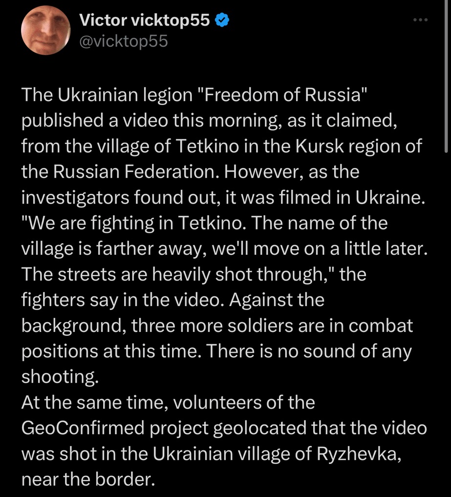 Anti-Kremlin paramilitary group Legion Freedom of Russia attacked the Russian territory near the Ukrainian border. It has allegedly conquered the village Tyotkino in the Kursk region and the Russian soldiers have allegedly fled. The Russian correspondent of the Radio Free Europe, Mark Krutov however points out that the victory announcement video was filmed at the territory of Ukraine.