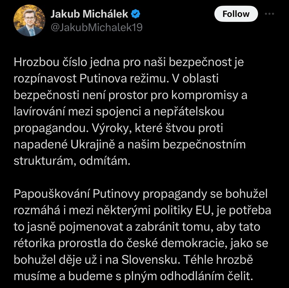 Parroting Putin’s propaganda is spreading, unfortunately among some EU politicians. We ought to point it out and prevent this kind of rhetoric seeping into Czech democracy, as is now happening in Slovakia. We will oppose this threat with resolve.