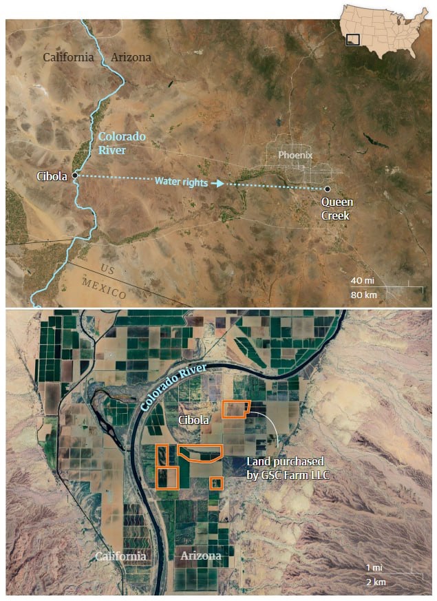 Then, in 2018, the company sold the water tied to that farmland to Queen Creek, a fast-growing sprawl of gated communities on the outskirts of Arizona’s capital. The city’s government agreed to pay the company $24m for the annual entitlement to 2,033 acre-feet of Colorado River water.