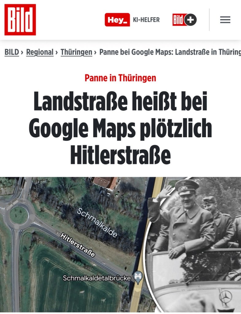 Hitlerstraße insomniacresurrected Cursed Images 29th May 2024 1 Minute I could not believe this shit… but… Source Google Maps change the name of the street to one named after the Führer. Share this: Click to share on X (Opens in new window) X Click to share on Facebook (Opens in new window) Facebook Like Loading... Published by insomniacresurrected View all posts by insomniacresurrected Published 29th May 2024
