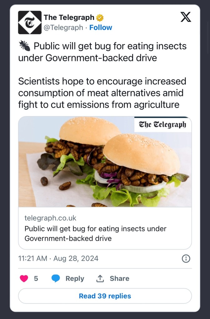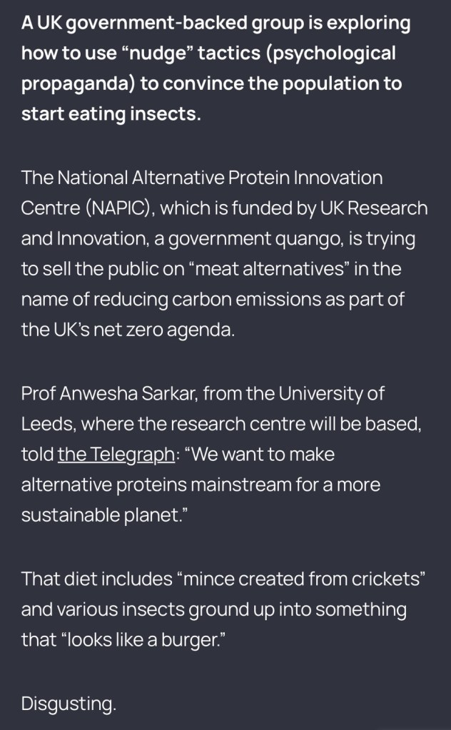 The elites clearly want us to have the living standards of bug eating savages in Congo. I hope to be rich enough to eat steak. 🥩 I pity the poor that will be nudged into eating bugs by propaganda and other means of coercion in the name of some communist bullshit about emissions, overpopulation, food crisis and what not.