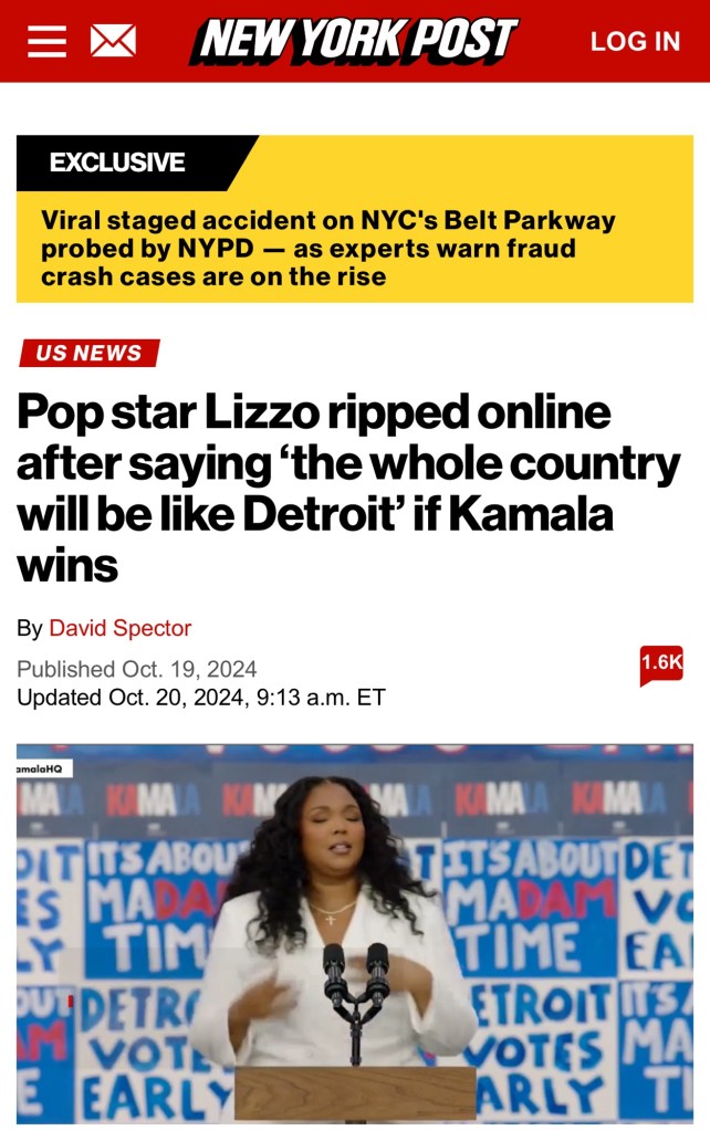 Lizzo was campaigning for Kamala in her hometown, which happens to be Detroit, and she was no doubt expressing local patriotism. Little do people that laugh at this realize that Detroit is not what it used to be. My information is it lifted its ass out of the gutter, and the Murican rust belt is actually getting revitalized.