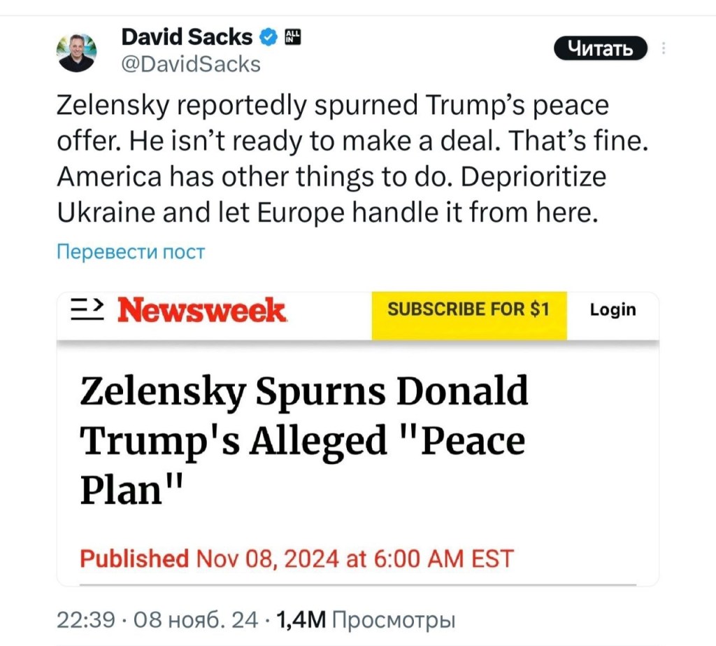 Ukrainians Reject Trump’s Peace Plan insomniacresurrected Ukraine 10th Nov 202410th Nov 2024 1 Minute I am seeing these headlines this morning… Derp derp… European peacekeepers, derp derp… Ukraine not in NATO for 20 years. Share this: Click to share on X (Opens in new window) X Click to share on Facebook (Opens in new window) Facebook Like Loading... Published by insomniacresurrected View all posts by insomniacresurrected Published 10th Nov 202410th Nov 2024