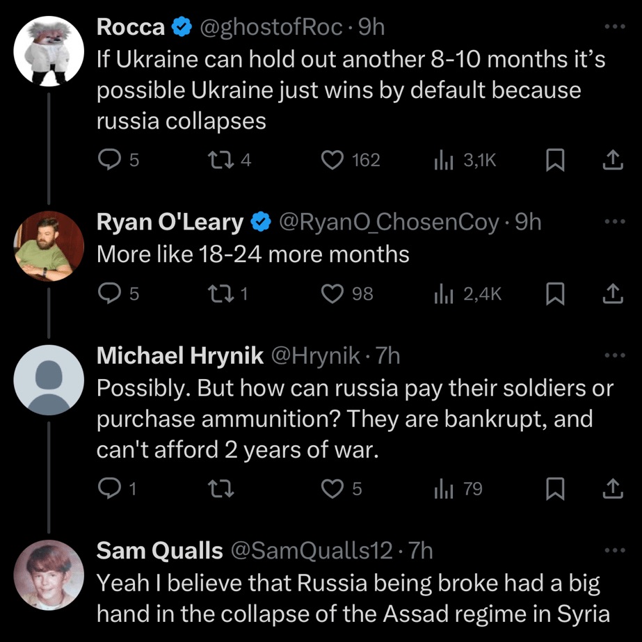 My contention has always been that the war will rage until 2026. Somewhere between now and then, the Ukrainian military will melt away, and Russia will impose its will on Ukraine. Or, if the pro-Ukraine crowd is correct, Russia will run out of steam.