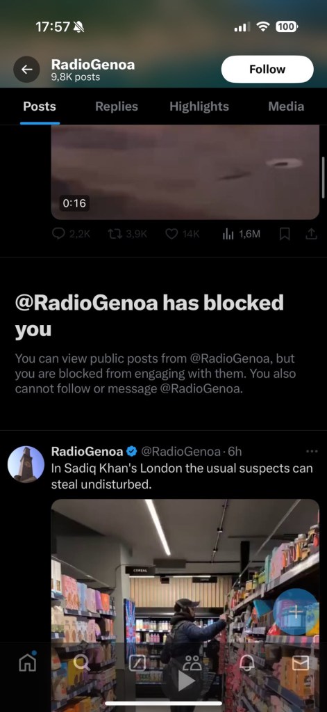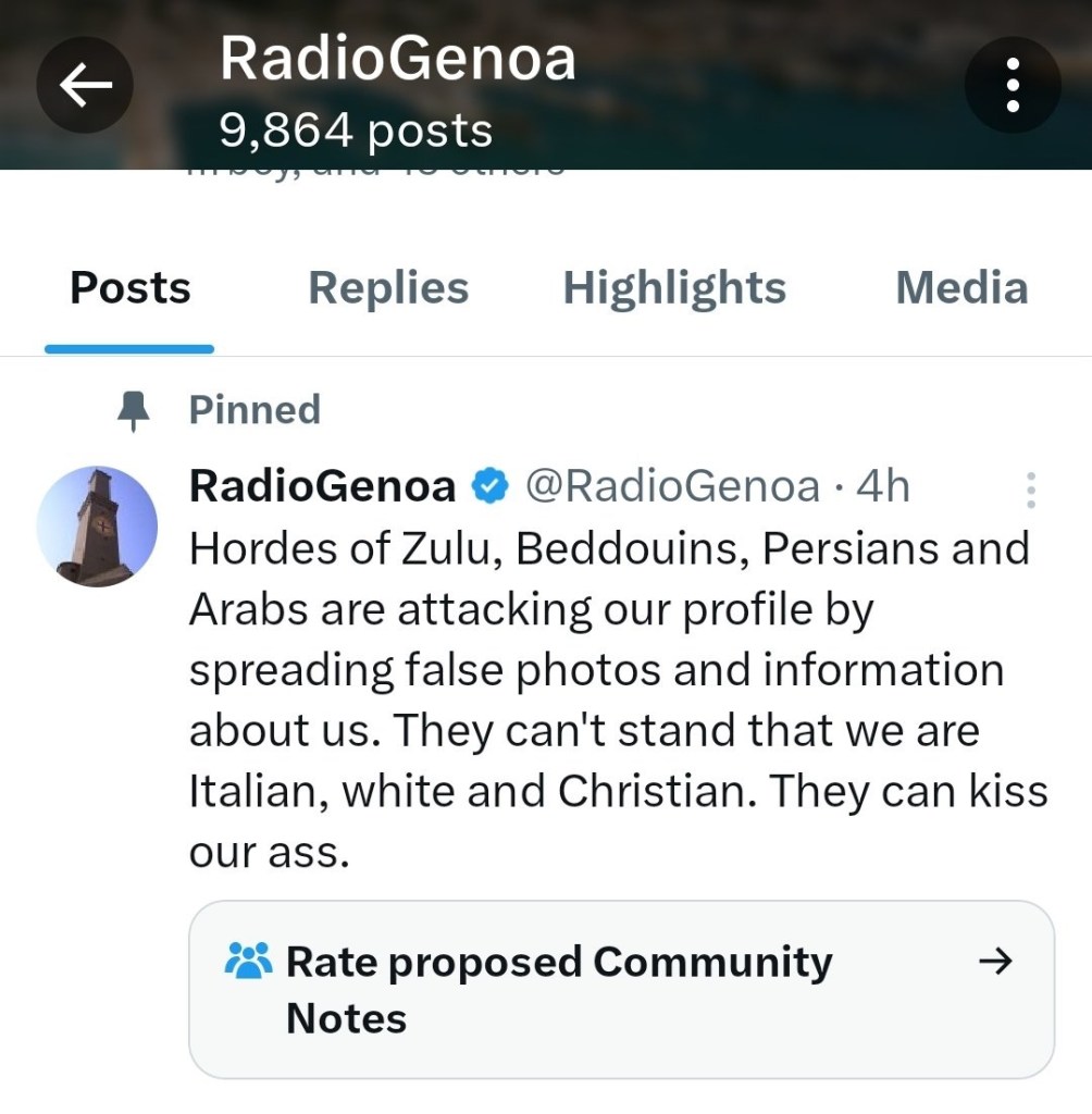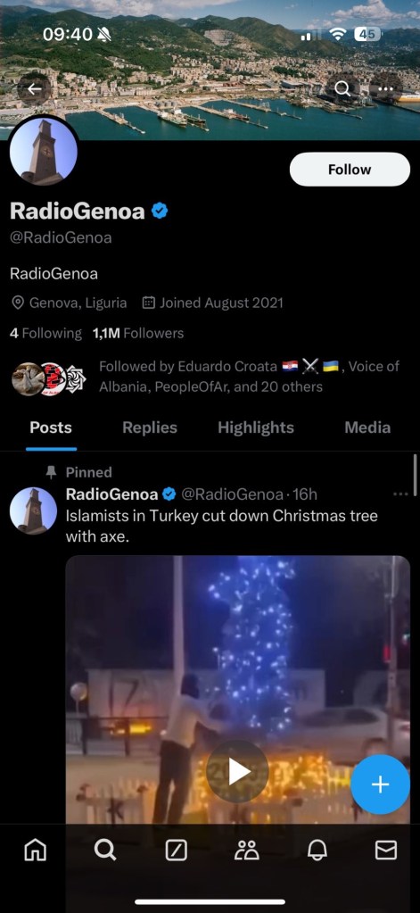 Radio Genoa is a channel on X that posts anti-immigrant and anti-Islam videos. Usually accompanied by some basic commentary that does not tell you shit, and it has a tendency to repeat the same content over and over.