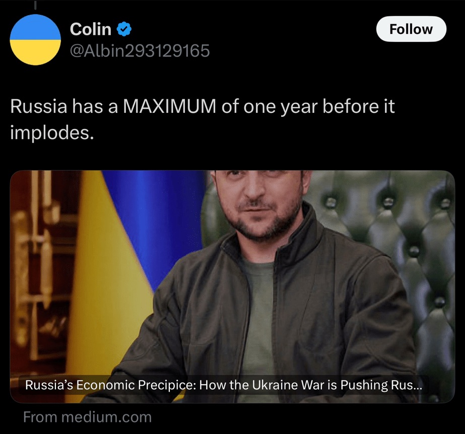 The linked article is by Colin Gajewski, who says Russian economy is so bad that it will inevitably force Russia’s withdrawal from Ukraine. Ukraine needs to suffer a little more, and Putler will break. This oracle is fresh, we will see who breaks first, the Russian economy or the Ukrainian defense line.