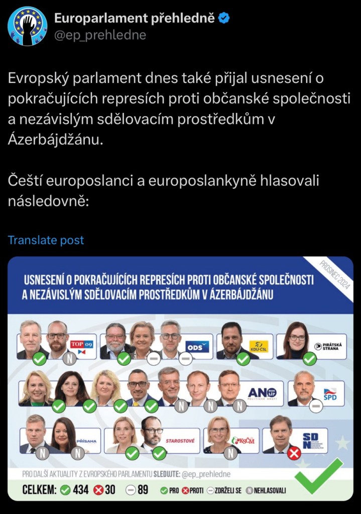 In December last year, the European Parliament has passed a resolution criticizing the Azeri government for repression against “civil society and independent media” -a nice euphemism for the granteater. Out of Czech MEPs, the biggest globohomo shills voted for it.