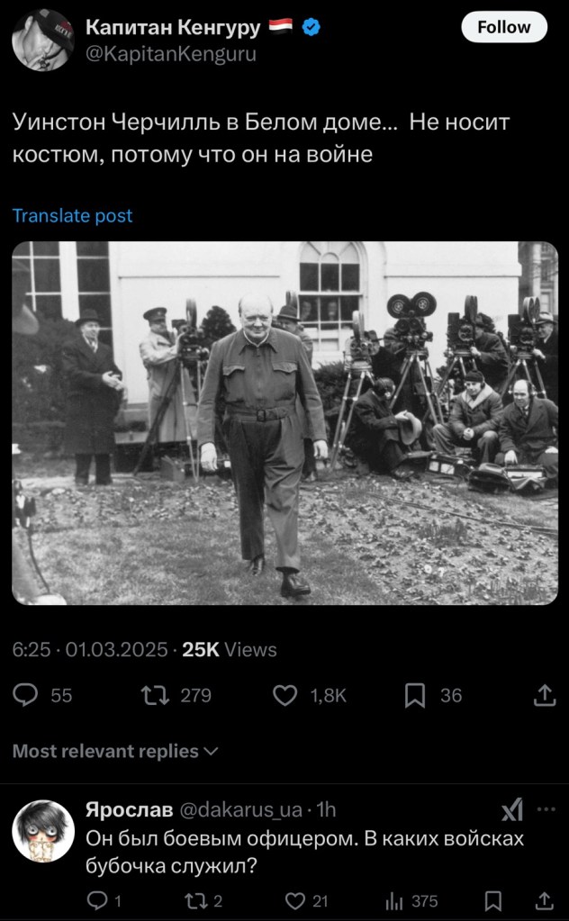 Winston Churchill in the White House does not wear a suit because he is at war. The people are commenting that Churchill was an army officer. Zelensky is actually a draft dodger. And Zelensky does not wear a military uniform. 😆 He wears a t-shirt without a collar with an embroidered Tryzub, the national symbol of Ukraine. The Tryzub is likely what Prince Vladimir used to brand his slaves and cattle with. 😆