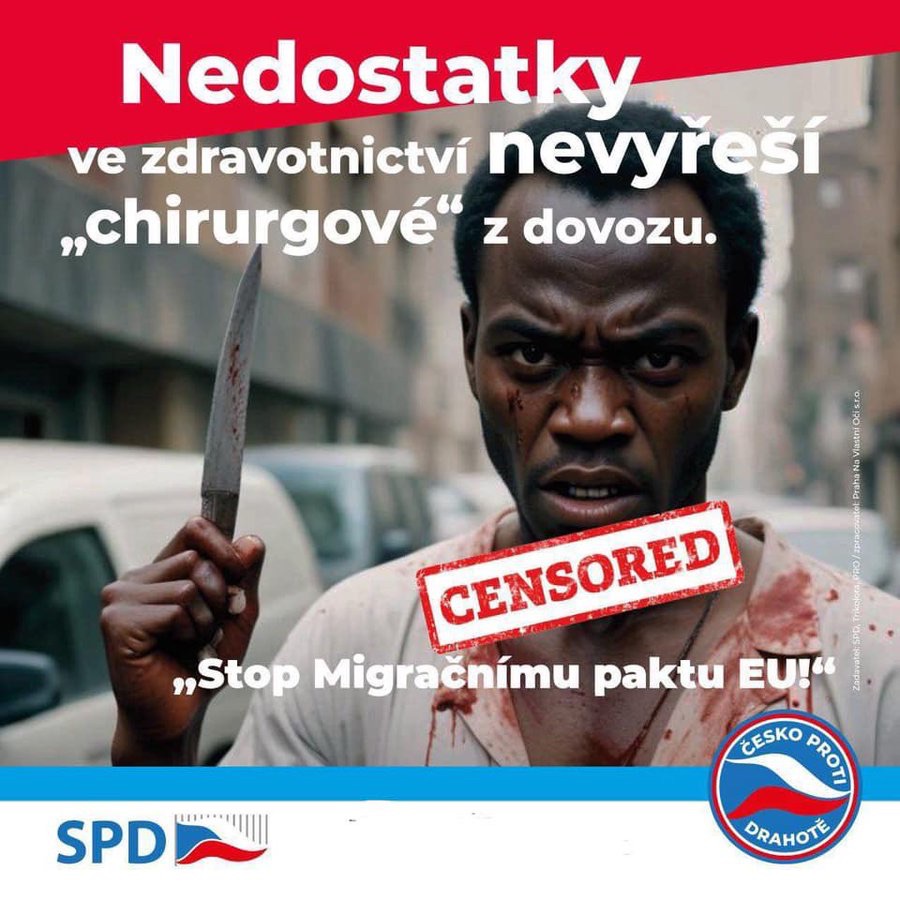 Portraying darker races in a bad light is however treated a criminal offense in Eurocuck countries. in Czechia, anti-immigrant party, the SPD, and its leader, Tomio Okamura are investigated for a poster that said. āDeficiencies in healthcare will not be solved by imported āsurgeonsā. I think this is play on the ādoctors and engineersā memeā¦