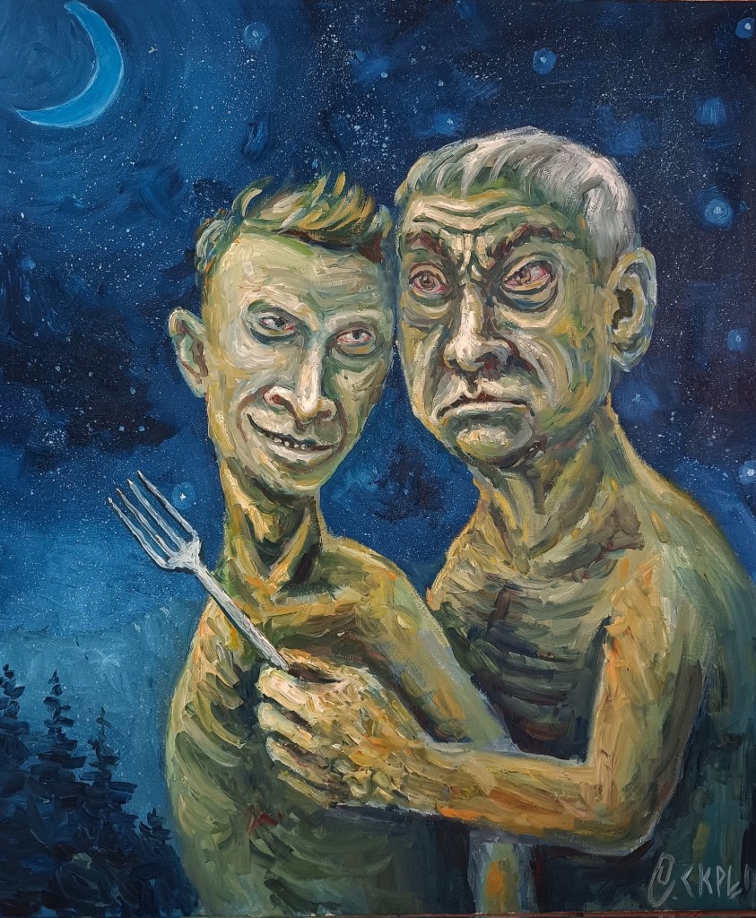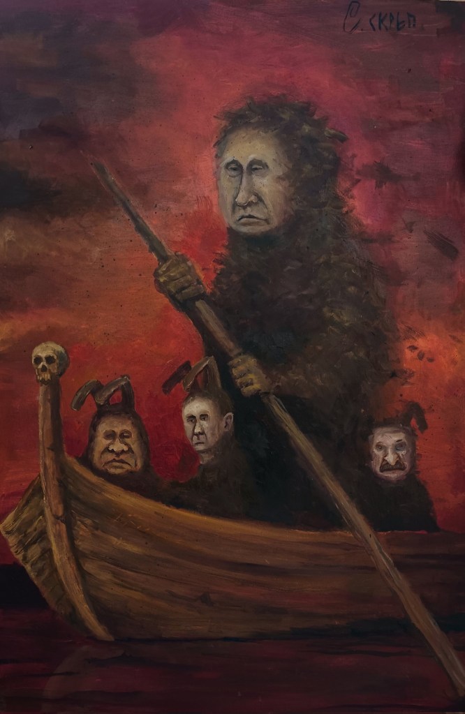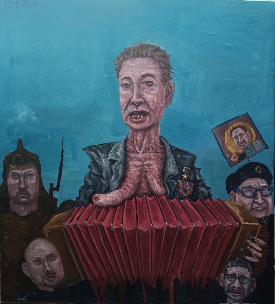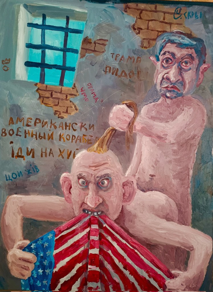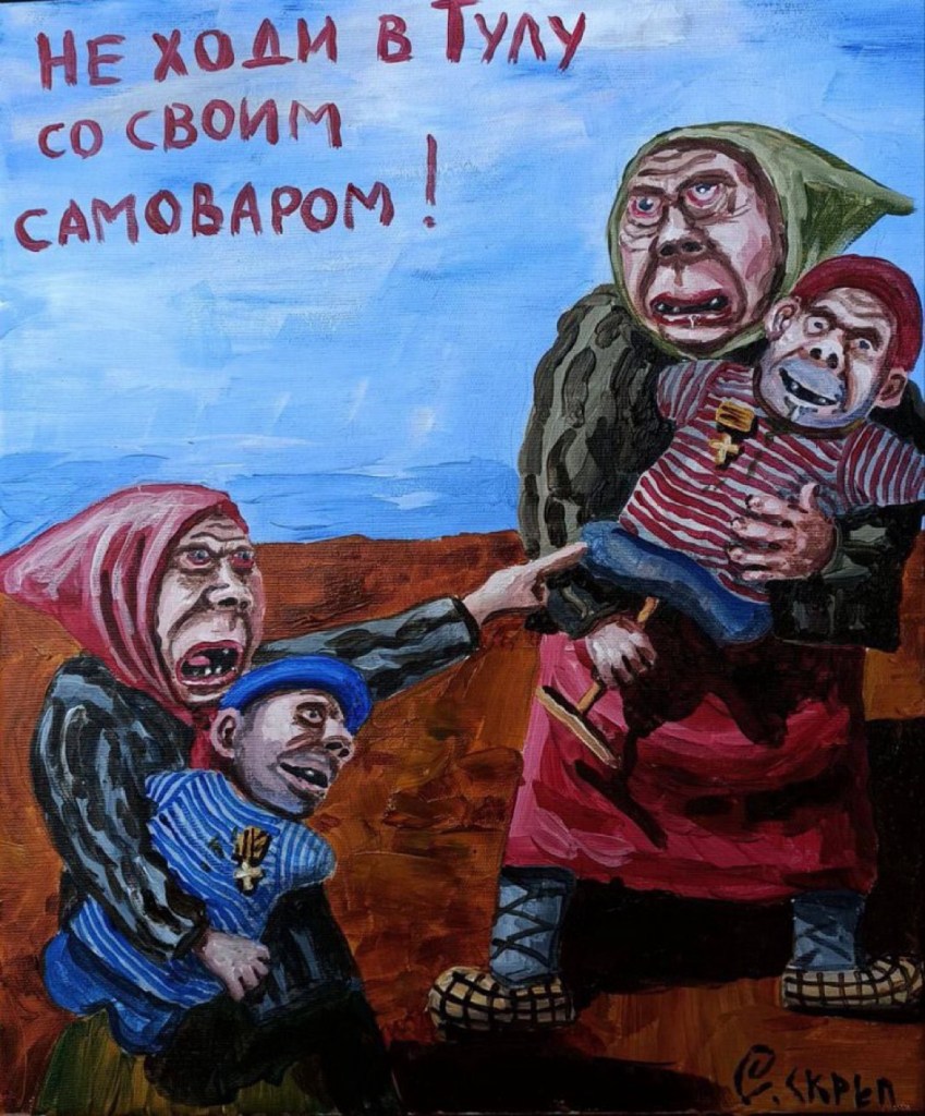 I love the above. You have non-Slavic representatives of Ukrainian business and political establishment (I see Umerov, Kolomoysky and Akhmetov, I don’t know who the other nosey mother fucker is) watching a fight a fight between a guy in a ushanka and a vatnik coat with another who has a shaved head with a knot and wide pants called sharovary. The vatnik clad mother fucker is supposed to symbolize a Russian. And the idiot larping as a Cossack is Ukrainian. Two manlets remaking Zelensky and Putin are urinating on Van’ka and Tarasik. Skrepetsky doesn’t hold love for anyone.