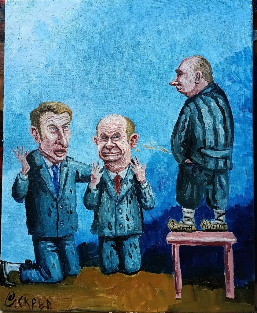 Putin in vatnik pissing into the faces of Macron and Scholz, GENIUS! 😆
