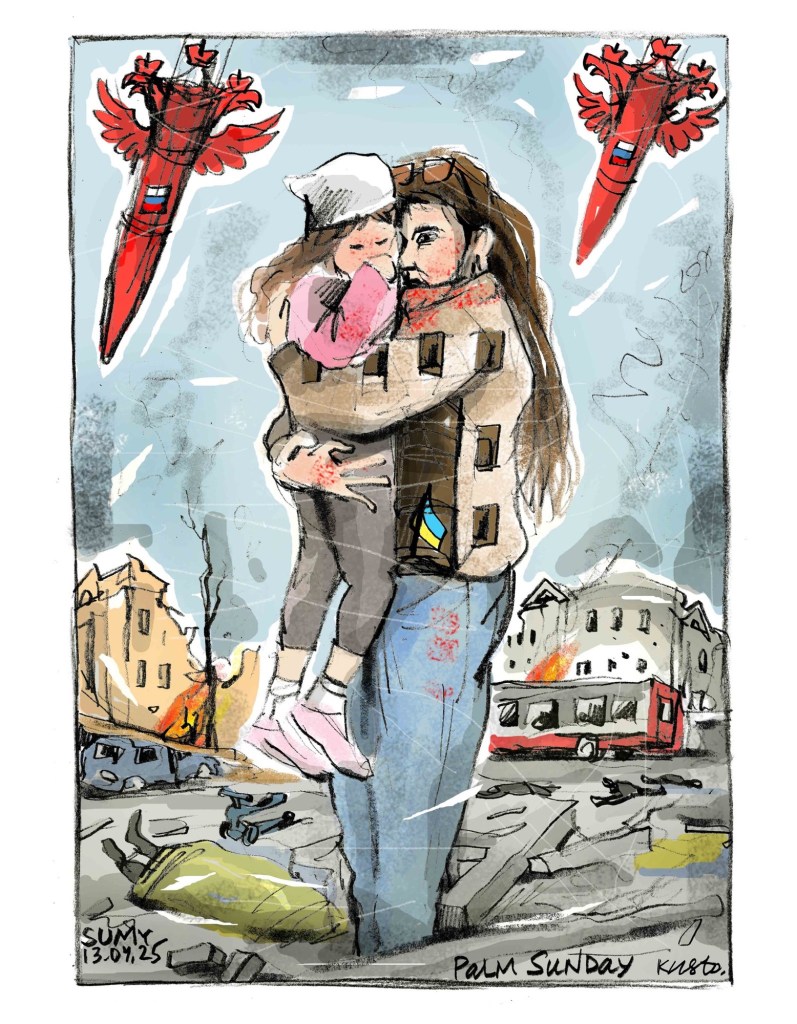 Dead civilians on Palm Sunday, Church, people gathering for mass, good Christians. Russians destroyed the idyl with a missile.