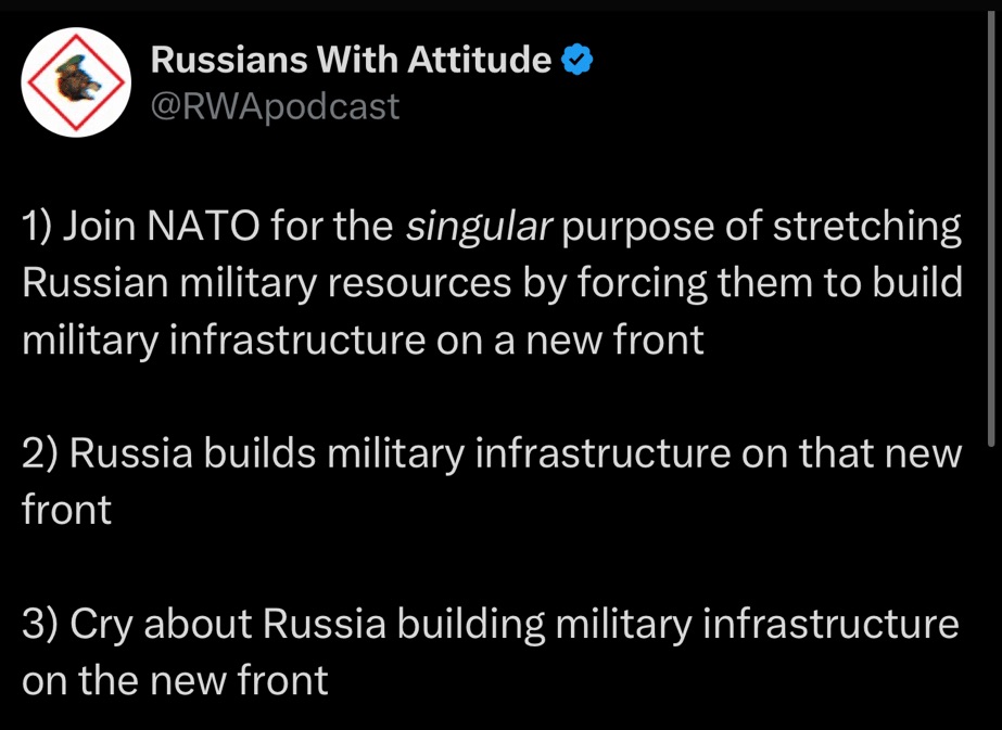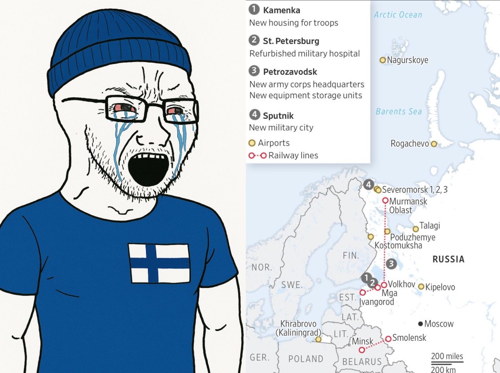 Russia Builds Military Infrastructure Along Border with Finland insomniacresurrected Russophobia 30th Apr 2025 1 Minute Finland was neutral not so long ago… Share this: Click to share on X (Opens in new window) X Click to share on Facebook (Opens in new window) Facebook Like Loading... Published by insomniacresurrected View all posts by insomniacresurrected Published 30th Apr 2025
