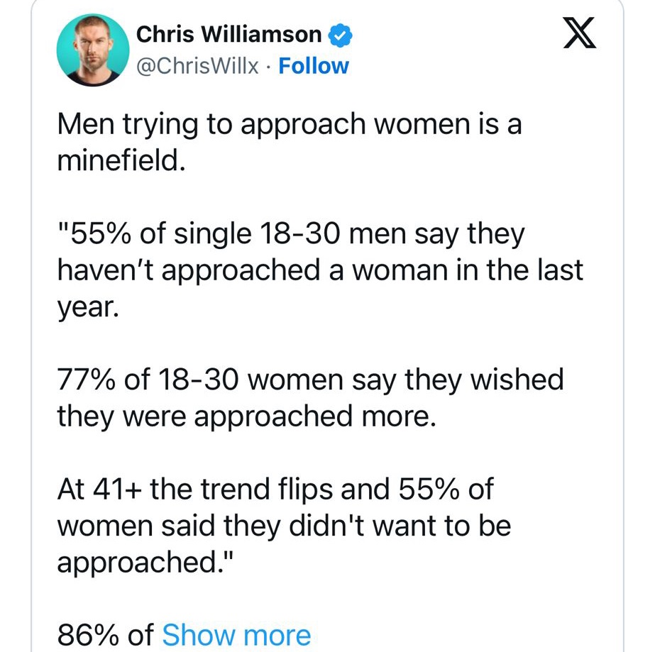 As a result, Zoomers have been characterized as the sexless, friendless, teetotaler generation. They’re not drinking, going to parties, having sex, or partnering up, they’re just… scrolling. It’s to the point where 45% of 18 to 45-year old men have never approached a woman in person. This is reflected in the discourse through popular online anecdotes observing the comparative social aloofness of modern men. Women have started to vocally lament the lack of approaches, and research bears this out too. 74% of women under the age of 25 and 77% of women aged 18-30 express a strong desire to be approached more often.