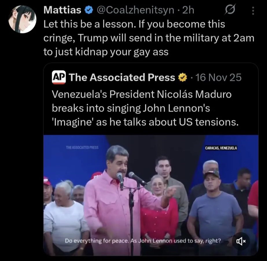 I still don’t know what the fuck happened here. But to tell you the truth, Venezuela is a joke. South America in general produces cringe politics, grotesque violence, poverty porn… South American countries are poster children for bad economic policies world wide. Even this kidnapping of Maduro reeks of corruption, he was probably betrayed by people in his government from the looks of it.