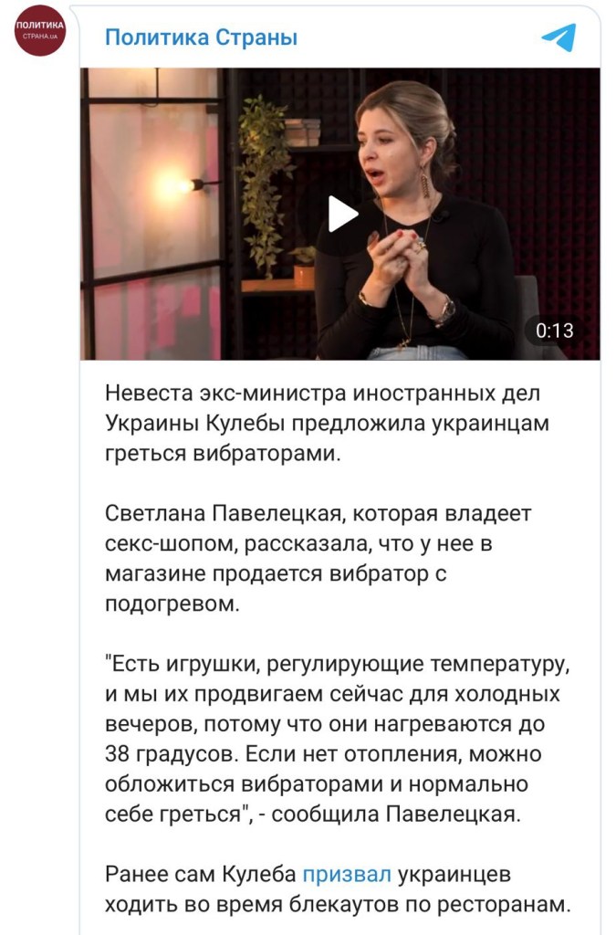 This was suggested by the fiancée of the former minister of foreign affairs of Ukraine, Dmytro Kuleba, Svitlana Paveletskaya.