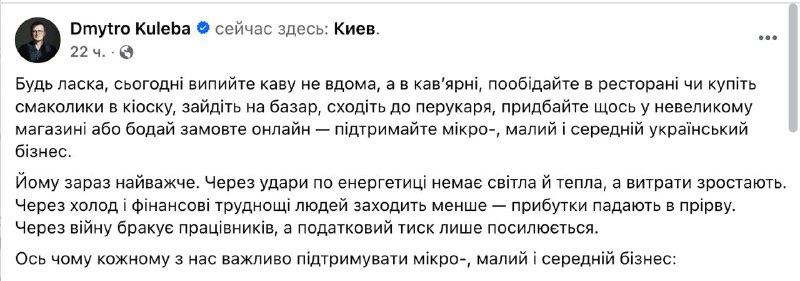 Please, today, drink a coffee not at home but in a coffee house, have a lunch in a restaurant or buy a snack at a kiosk, go to the bazaar, visit a hair stylist, buy something at a small shop or for the grace of god buy it online – support small and mid-tier Ukrainian business.