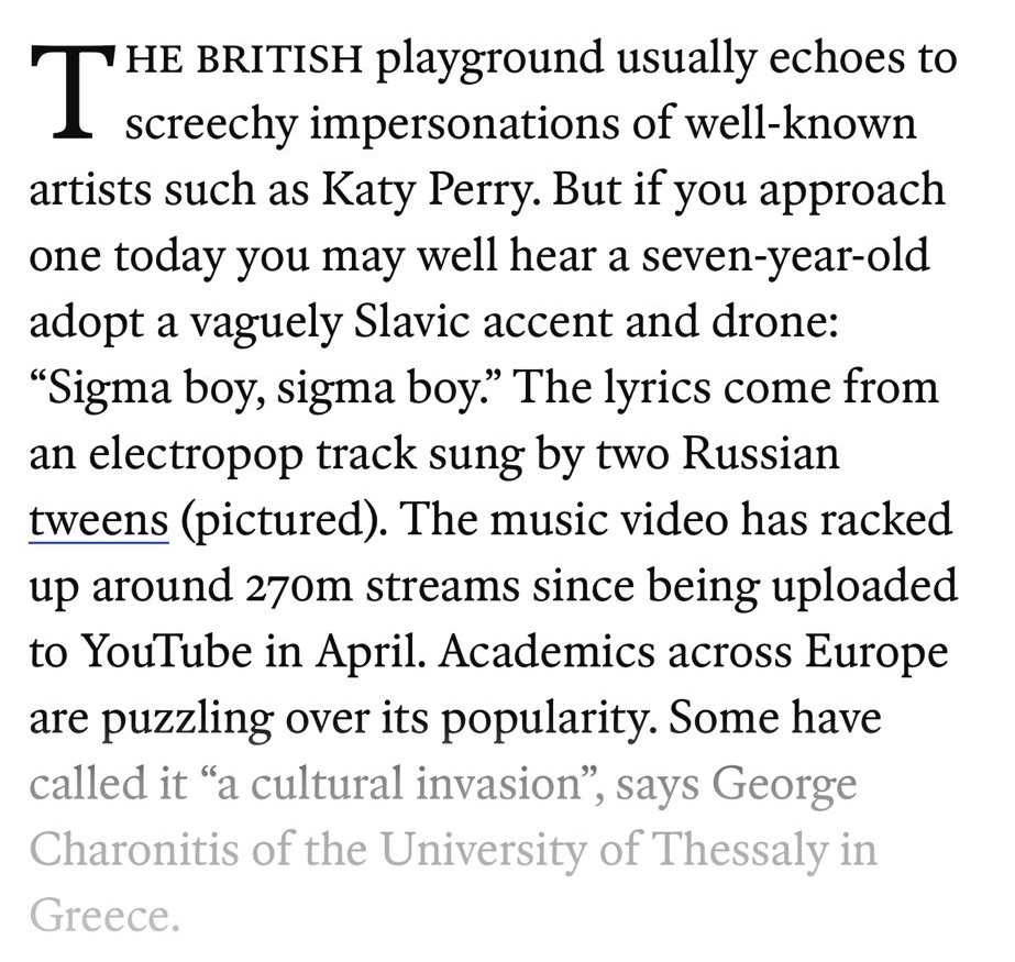 Russian song that allegedly conveys pro-Russian and patriarchal views, according to dumb sheboon, Nela Riel. Actually, the song is about an attractive boy that the girls like (that apparently is patriarchy)…