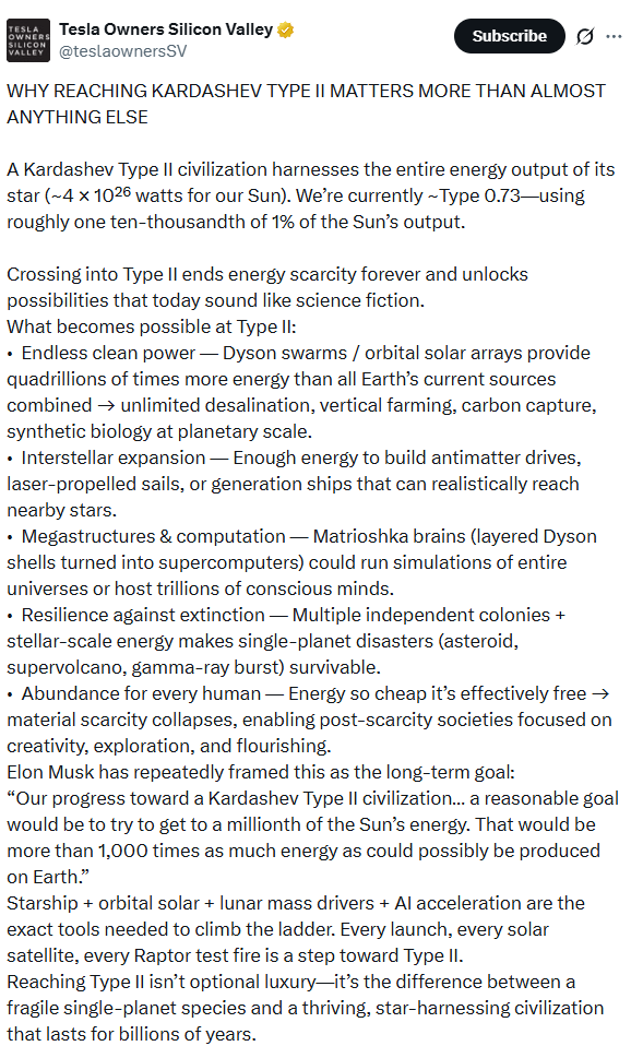 That’s how I understand it, and humanity is currently close to Type I and should achieve type one by 2100 according to Michio Kaku. Elon wants to accelerate this evolution. He now wants a base on the Moon. This should aid his journeys to Mars. But also could be motivated by Chinese-Russian plans to build a lunar base.